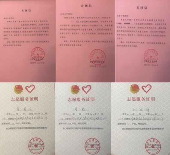 信中提到,孙崧博、肖国庆、周琰三位同学于2020年2月1日至2020年3月16日参加济南战“疫”志愿服务新闻宣传工作。三位同学服务于共青团济南市委“青春济南”新媒体工作室,其制作编辑的微信内容既能体现正能量,又被广大团员青年所接受,他们敢于担当、踏实肯干,用实际行动展现了共青团员的责任与担当。为此,共青团济南市委向他们颁发了志愿服务证书。