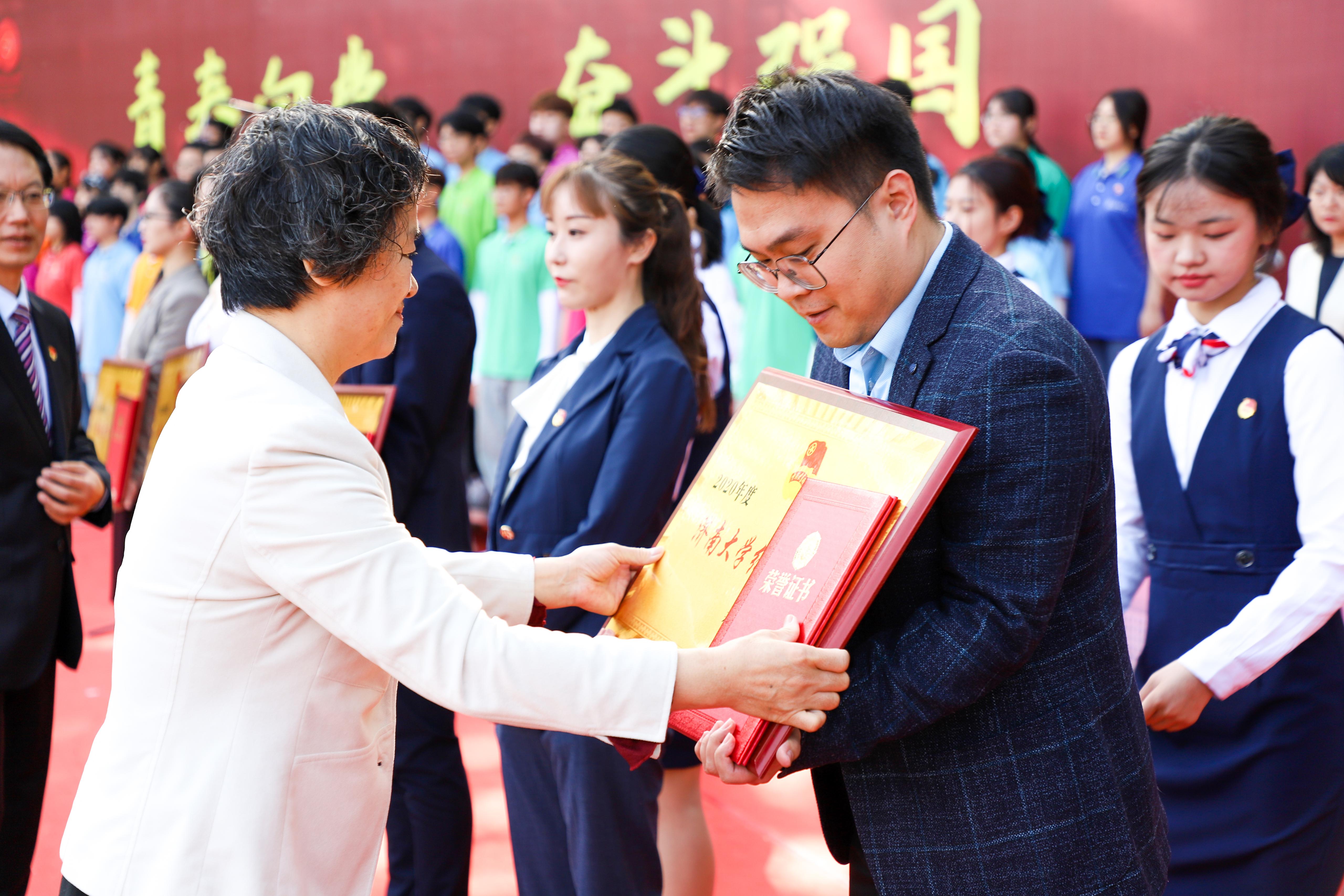 过去的一年,yl23455永利共青团以昂扬向上的精神和扎实努力的工作培养出一批政治坚定、德才兼备、素质全面、模范表率、堪当重任的新时代青年。为弘扬五四精神,彰显青春力量,树立先进典型,活动现场隆重表彰了2020年度涌现出的yl23455永利共青团系统先进集体和先进个人。以奋斗给青春赋能,生命必然熠熠生辉,学校团委特别邀请了山东青年五四奖章获得者胡勋、山东省向上向善好青年获得者孙明旭、第十二届中国青少年科技创新奖获得者邵月文、yl23455永利“十佳团员”代表王立明、基层团支部代表臧金凤、新发展团员代表徐培杰六位优秀青年师生代表,通过国旗下演讲的形式分享了他们不忘初心、砥砺前行的青春故事,以激励更多青年胸怀梦想、脚踏实地,“团”聚青春正能量,“团”结青年共成长。质朴感人奋斗感悟引发在场师生强烈共鸣。