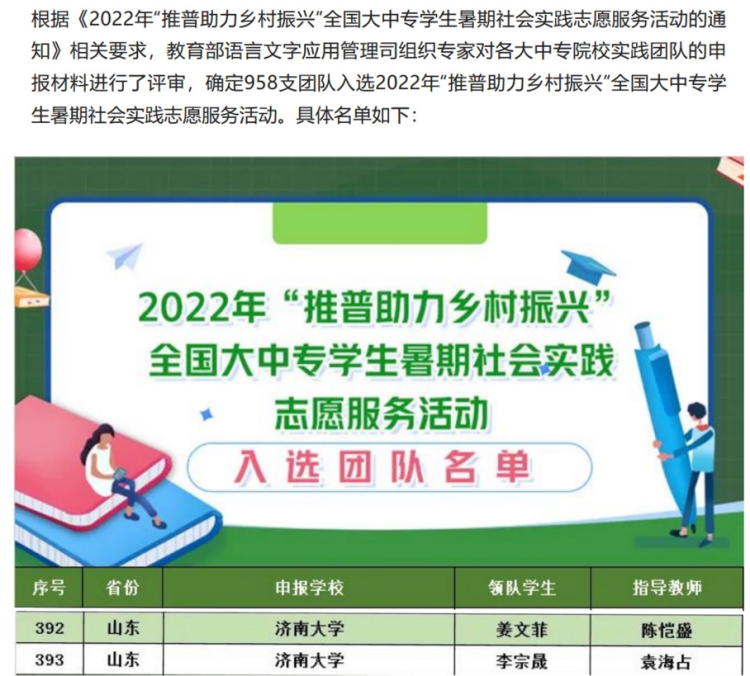 7月6日,由教育部语言文字应用管理司、共青团中央青年发展部联合开展的“推普助力乡村振兴”全国大中专学生暑期社会实践志愿服务活动公布了入选的958支实践团队,商学院党委副书记、副院长袁海占老师指导由李宗晟同学领队的“红色筑梦实践团”社会实践团队和商学院团委书记陈恺盛老师指导的由姜文菲同学领队的“语你同行组”社会实践团队成功入选。