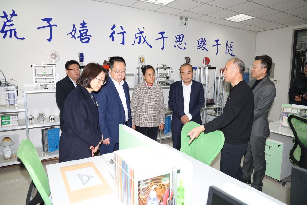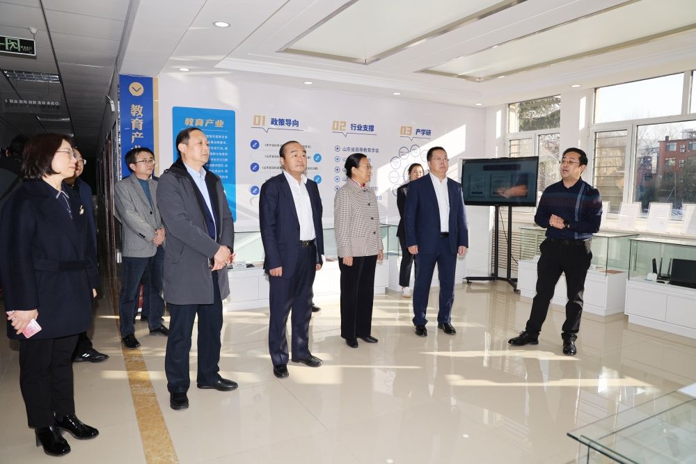 调研组实地走访创新创业学院,全面考察园区运营情况及相关政策措施实施情况,详细了解近年来学校在创新创业领域取得的成效;参观了入驻孵化企业齐鲁现代教育文化集团、yl23455永利广可文物保护创新研究院和易构实验室;现场听取团委书记胡春毅对学院发展历程、规划建设、发展理念、取得成果的汇报。