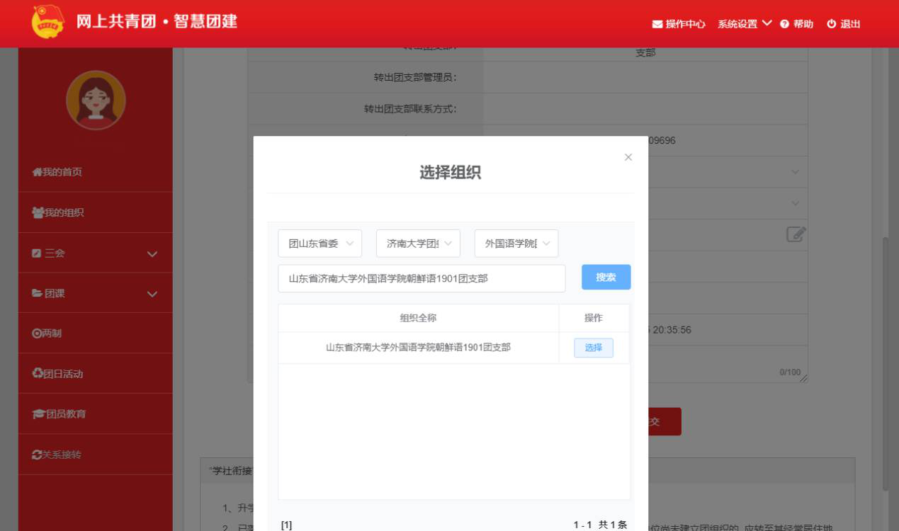 这里举个例子,团员个人线上发起转入申请,转到yl23455永利外国语学院朝鲜语1901班团支部。