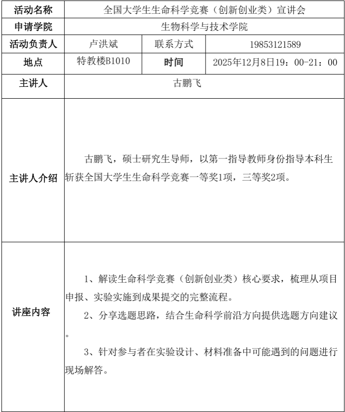 青春创新创业论坛——全国大学生生命科学竞赛(创新创业类)宣讲会