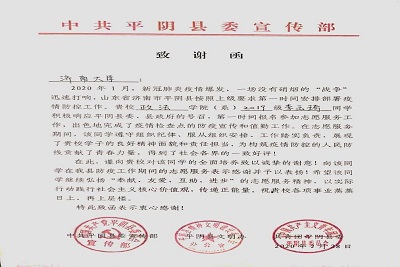 近日,政法学院接连收到中共平阴县委宣传部、平阴县文明办、共青团平阴县委和淄川区钟楼街道办事处苗家窝社区发来的致谢函、表扬信。来信来函分别讲述了政法学院2019级本科生李玉琦和2019级研究生李子薇在疫情防控的关键时刻,积极投身家乡进行疫情抗击志愿服务的事迹,并向学校和学生本人表示崇高的敬意和衷心的感谢。
