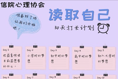 特殊时期,为进一步提高大学生的心理素质,促进大学生的身心健康和谐,宣传普及心理健康知识,深入开展心理健康教育。自4月19日起,信息学院学生会心理协会举办了“读取自我30天计划”的活动,在接下来的30天里,每天准备了一个问题,它或许可以丰富我们的精神世界,或许可以让我们重新认识自己。