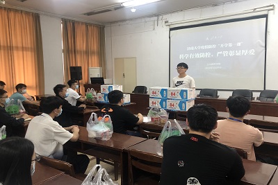 近日,土木建筑学院2017级研究生李加鹏、2016级土木工程专业马玉琨分别向学院捐赠了一批一次性医用外科口罩和84消毒液。土木建筑学院班子成员、全体辅导员以及返校学生参加了捐赠仪式。