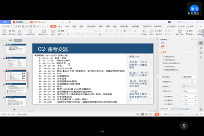教管专业李明阳学姐从如何择校择专业、如何备考英语、政治、专业课方面进行了经验分享,点明了坚持的重要性与坚持方法,让同学们对考研有了大体了解;特教专业耿康洁学姐重点讲述了备考时的时间计划安排,给同学们做了良好榜样作用;特教专业苑可欣学姐侧重讲了华东师范大学专硕有关信息,将有关专业向同学们做了辨析,让同学们对本专业可报专业加深认识;教管专业陈英学姐则谈到了复试的备考经验,给学弟学妹们提出了一些零散的建议。自由提问阶段,大家就如何选择考研专业、培训班的选择及其作用等方面向学姐们寻求意见和建议。