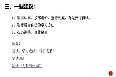 此次经验交流活动的成功开展,有效地帮助了我院学生明确考研方向,确立考研目标,以更加充分的准备投入到考研学习中来。同时也给在家有浮躁情绪的同学们一记定心剂,警示了我们虚度光阴的危害,极大地促进了同学们的学习热情,充分发挥了先进个体的带头作用。“休对故人思故国,且将新火试新茶。诗酒趁年华。”希望同学们能够珍惜时间、抓住机遇、坚持到底,考入自己的心仪院校。