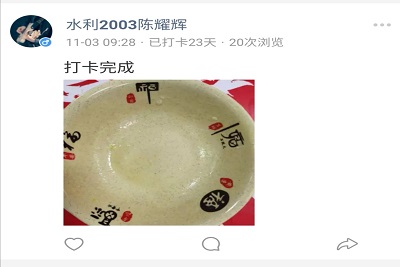 为进一步倡导光盘行动,水利与环境学院环抱碧水青年志愿协会于10月5日至11月8日开展“光盘行动,从我做起”线上打卡活动。
