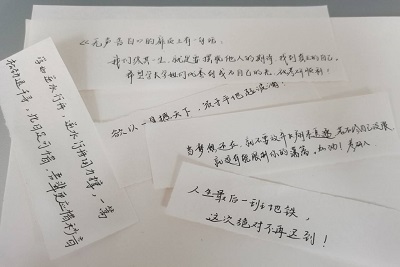 本次活动采用线上和线下相结合的方式。线上,通过QQ空间在全校范围内进行大力宣传,大一大二乃至大三的同学们热情高涨,纷纷踊跃报名,四百多条转发、四百多条祝福语,每一条都充满着爱,并在各大空间迅速传递。在众多寄语中不仅有“吾尽吾心,终亦不悔;天道酬勤,何事难为”,“有志者,事竞成,破釜沉舟百二秦关终归楚;苦心人,天不负,卧薪尝胆三千越甲可吞吴”等动人心弦的句子,给“加油”两字赋予诗歌的深厚韵味,将对学长学姐的鼓励之情表现的淋漓尽致;也有“愿付出都有回报 ,只管努力 结果交由天意”,“吃得苦中苦,方为人上人!考研加油!”等通俗易懂的句子,将对学长学姐的期许展于纸上,让这个寒冬不再冰冷。一个准备考研的学姐表示:“看到这些祝福语之后,真的很暖心,很激励,感谢各位学弟学妹的祝福。”