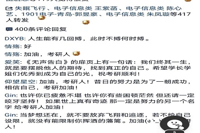 为了能给考研的学长学姐提供一些力所能及的鼓励,同时增强他们的信心度过最煎熬的时期 ,2020年12月8日,信息学院泉心泉益志愿者协会“研”于律己考研咨询服务队举行了“考研温暖寄语”活动。