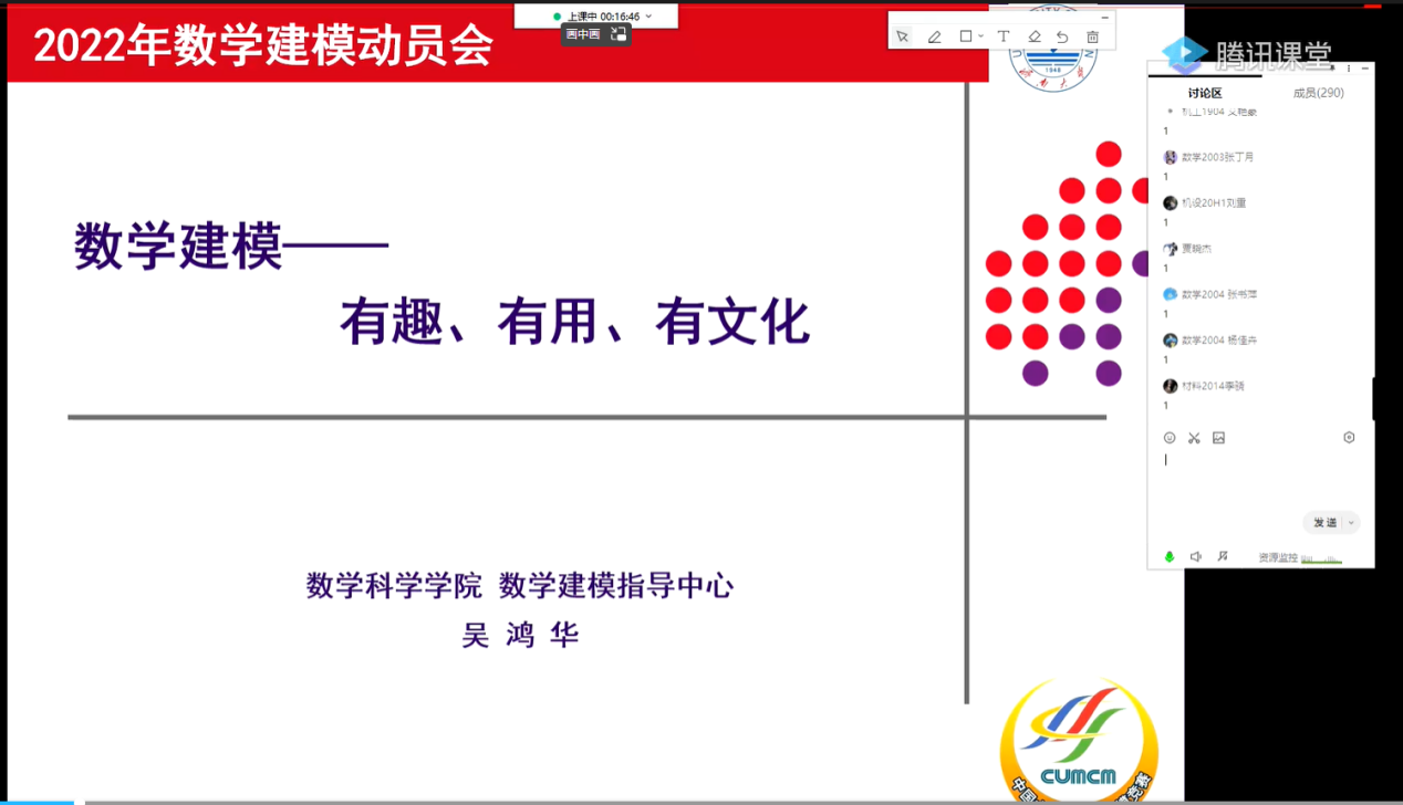 为助力我校学子了解数学建模、提高数学学习兴趣、培养数学应用实践能力,数学科学学院于3月15日下午线上举办了2022年大学生数学建模竞赛培训动员大会。本次大会由数学科学学院数学建模中心主任吴鸿华副教授主持,来自我校各院300余名优秀学子参加了会议。