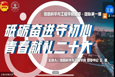 为着力发挥伟大建党精神的引领作用,履行好为党育人的职责使命,引导团员和青少年深刻感悟“两个确立”的决定性意义,增强“四个意识”、坚定“四个自信”、做到“两个维护”,以实际行动迎接党的二十大胜利召开。4月28日,信息科学与工程学院开展新学期“砥砺前行守初心,青春献礼二十大”的团委团队第一课主题团课活动,本次团课由王豪老师主讲。