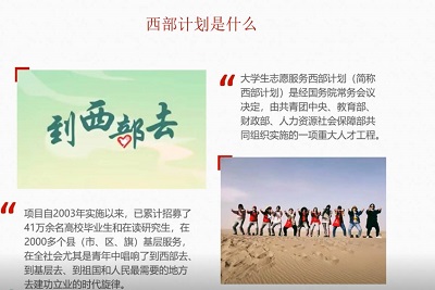 会上,王豪老师从今年的招募要求、计划安排、相关政策等进行了解读,也为毕业生如何参与好西部计划进行了相关培训。随后,邀请往届参与西部计划的志愿者进行了经验分享。来自新疆生产建设兵团第十二师志愿者邵长浩,第十二师五一农场志愿者张肖俊,第十四师47团志愿者李淑婷,第十二师职校志愿者王嘉琪、高铭慧、苏奕丹、高宇阳结合志愿服务的工作经历和收获体会一次进行了分享交流,鼓励学弟学妹们到基层去,到祖国需要的地方去服务奉献。随后,针对同学们的困惑和疑问进行了咨询和答疑。会议最后,王豪老师就报名参加“西部计划”与“山东计划”的注意事项进行了介绍。