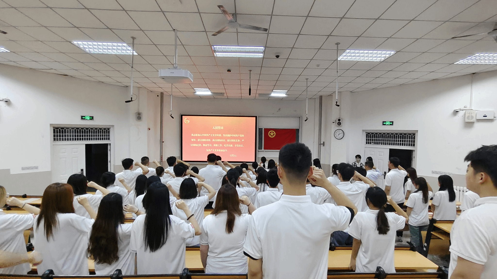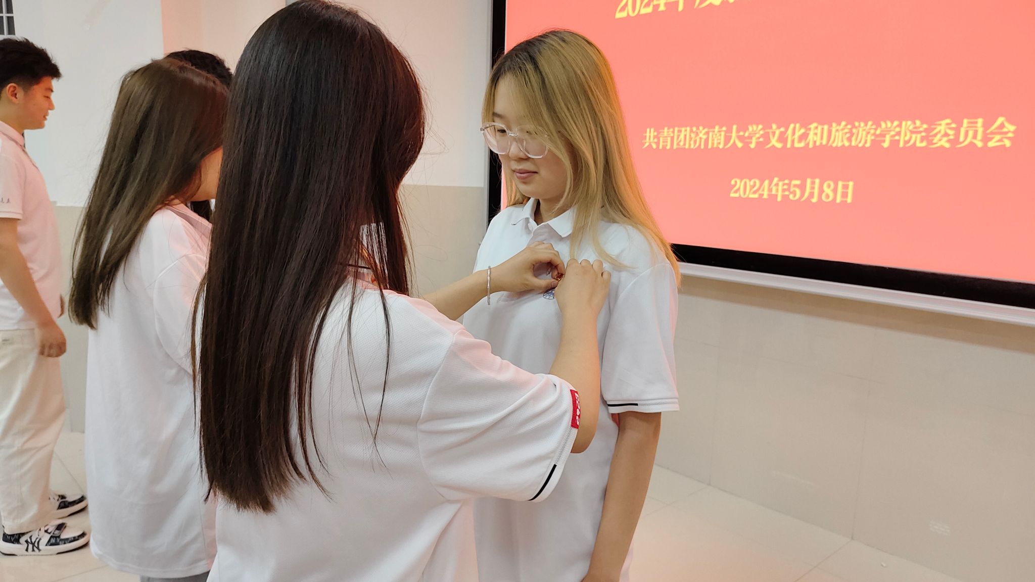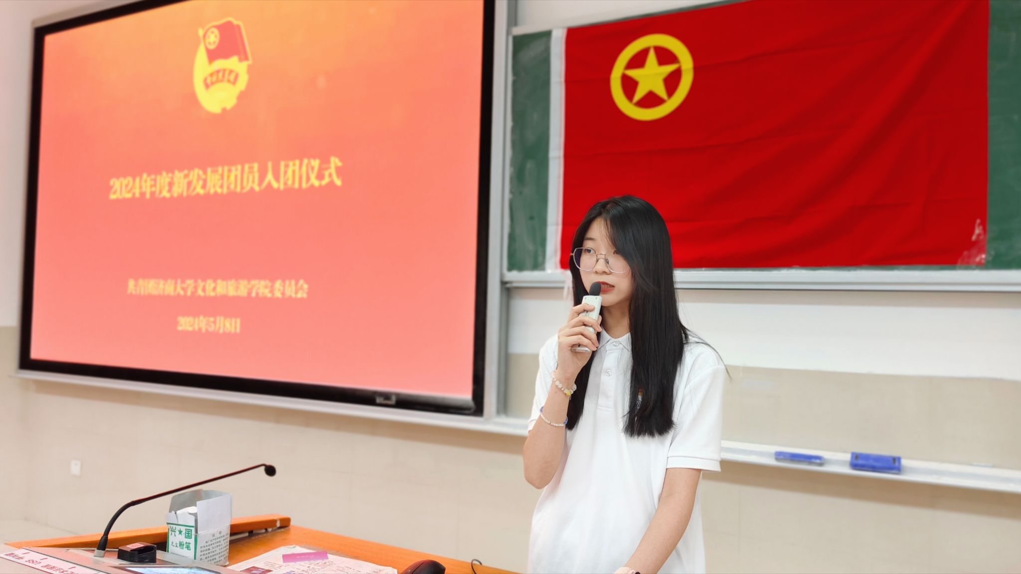 仪式在庄严的国歌声中拉开序幕。主持人首先宣布文化和旅游学院2024年度新发展团员名单,并由所属班级团支部委员为新发展团员佩戴团员徽章,颁发团员证。在学生会工作人员孙玉同学带领下,新老团员在团旗下庄严宣誓,表达他们加入共产主义青年团的决心和信念。