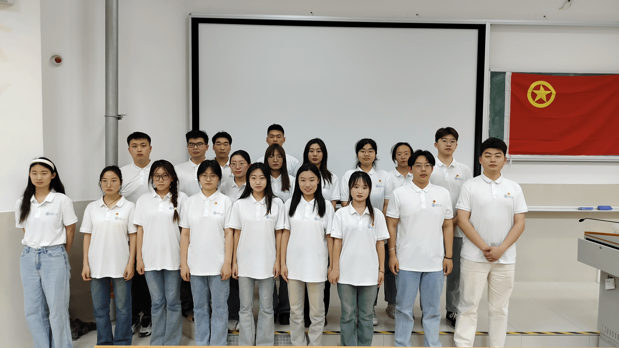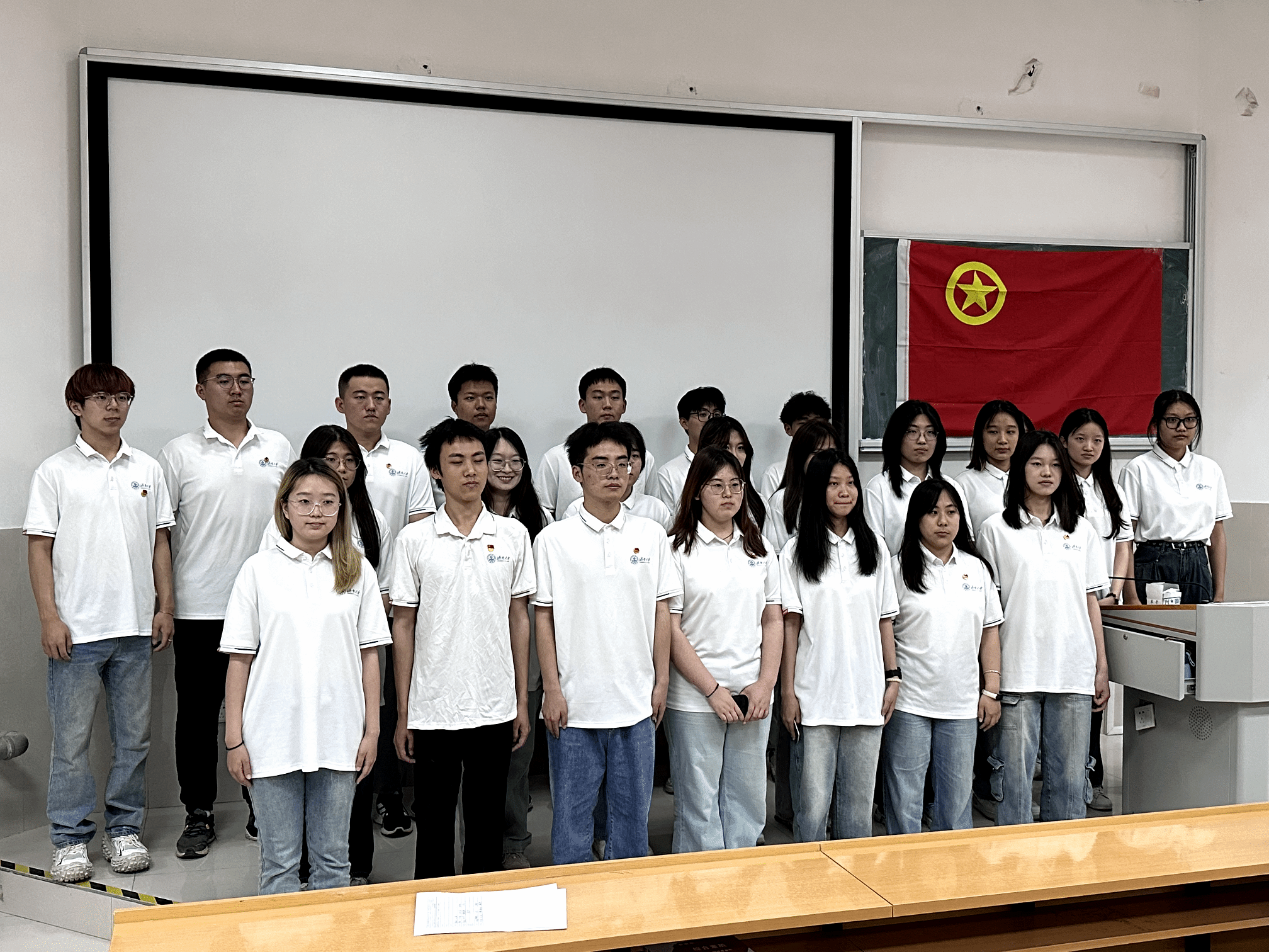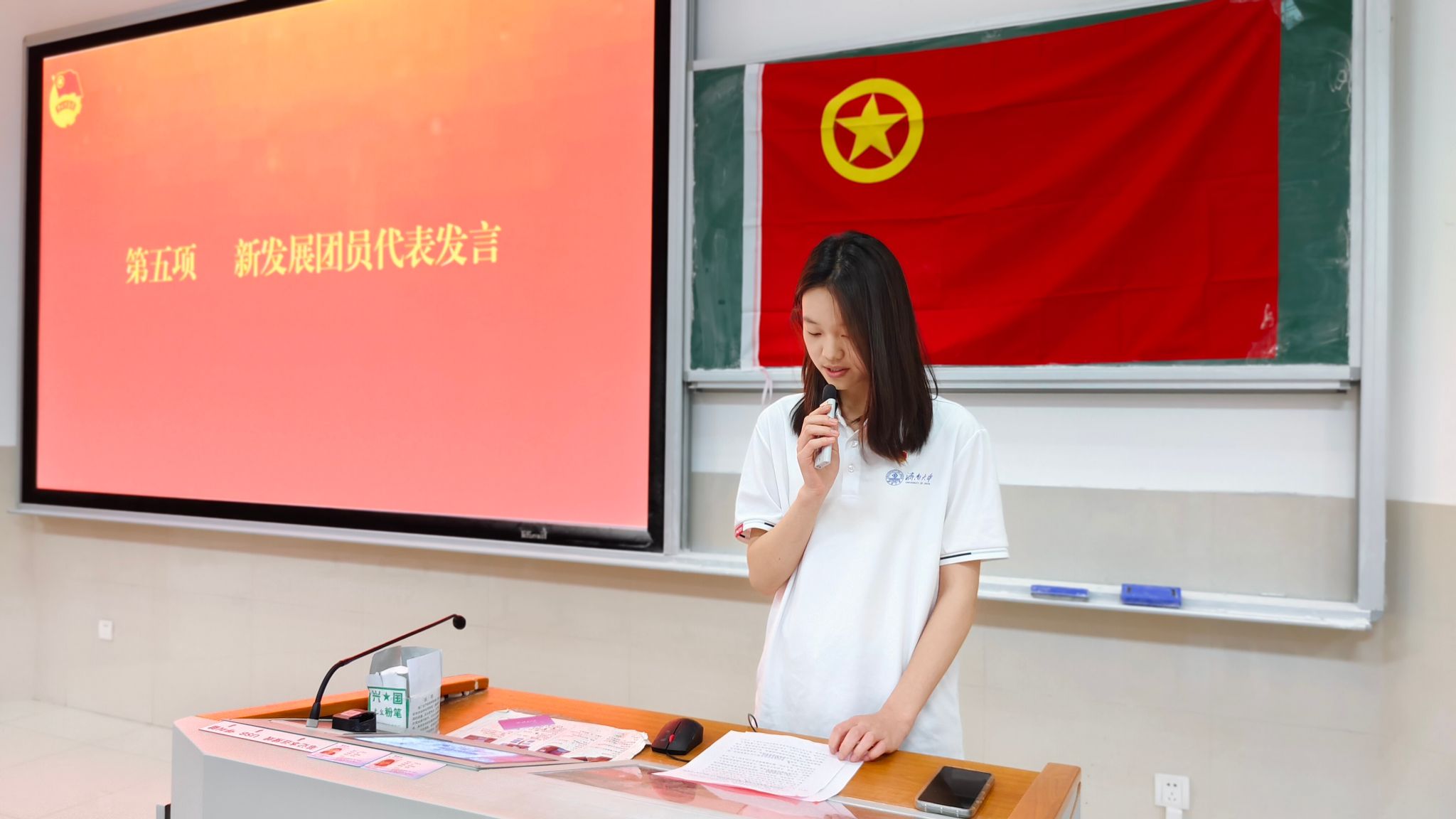 仪式在庄严的国歌声中拉开序幕。主持人首先宣布文化和旅游学院2024年度新发展团员名单,并由所属班级团支部委员为新发展团员佩戴团员徽章,颁发团员证。在学生会工作人员孙玉同学带领下,新老团员在团旗下庄严宣誓,表达他们加入共产主义青年团的决心和信念。