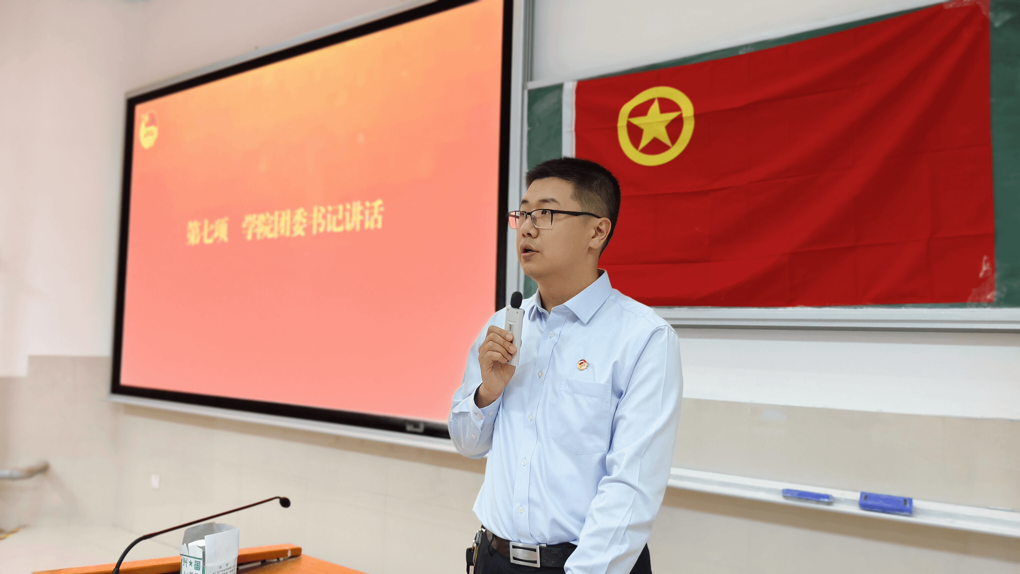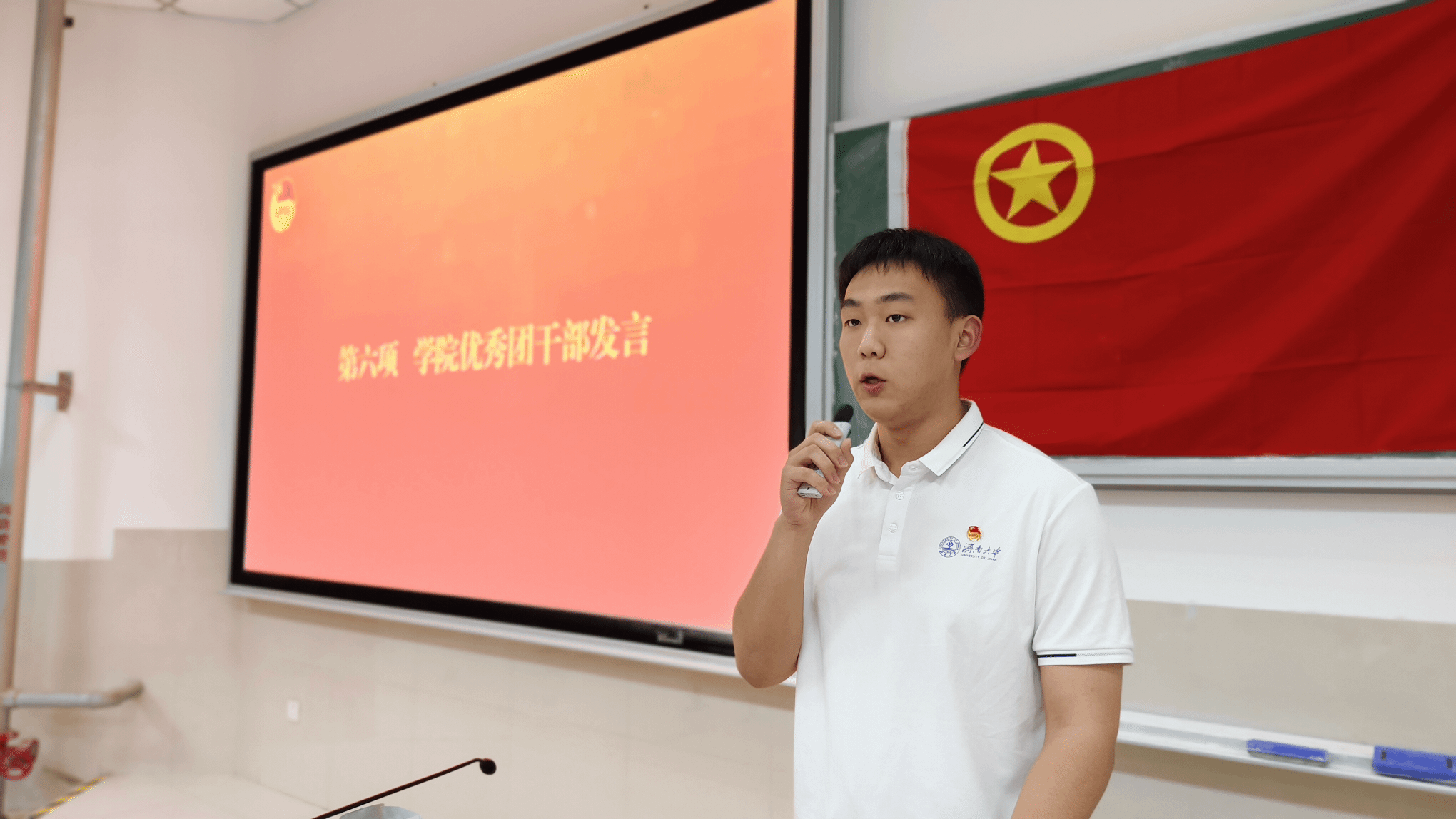 新发展团员代表、优秀团干部及学院团委书记分别发表讲话。新发展团员代表和优秀团干部号召全体团员时刻牢记团员身份,以团员标准严格要求自己。学院团委书记吕龙飞老师对新发展团员的加入表示热烈欢迎和衷心祝贺,同时对他们提出三点要求。一是要坚定理想信念,保持对党和人民的忠诚,胸怀爱国理想、笃行报国之志;二是要勇于担当,敢于在实践中锻炼自己,发挥模范先锋作用,做学院优良风气的营造者和示范者;三是要攻坚克难,面对困难与挑战,迎难而上,在学习和生活中争当先锋、勇担责任、引领风尚,为学院和团组织发展贡献力量。仪式最后,全体参会人员高唱中国共产主义青年团团歌,新发展团员和基层团干部合影留念,为入团仪式画上圆满句号。