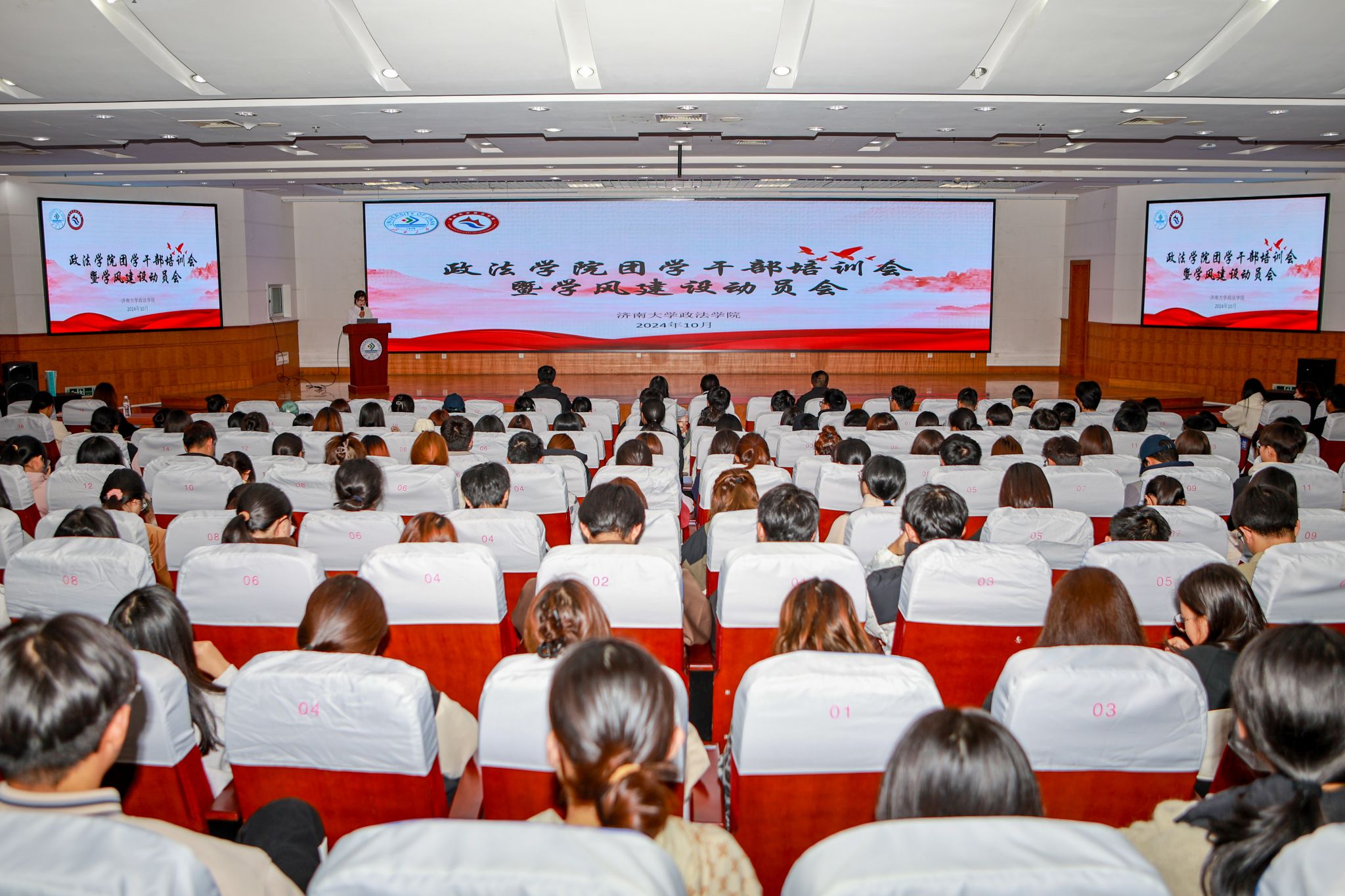 为加强学院团学干部队伍建设,提高团学干部的工作能力和综合素质,促进团学组织之间团结协作,进一步加强学院学风建设,10月25日,政法学院在第二学术报告厅组织开展团学干部培训会暨学风建设动员会。学院学工人员,学生组织主席团,班级团学干部,宿舍长参加会议。法学2305班团支书张晖晗主持会议。