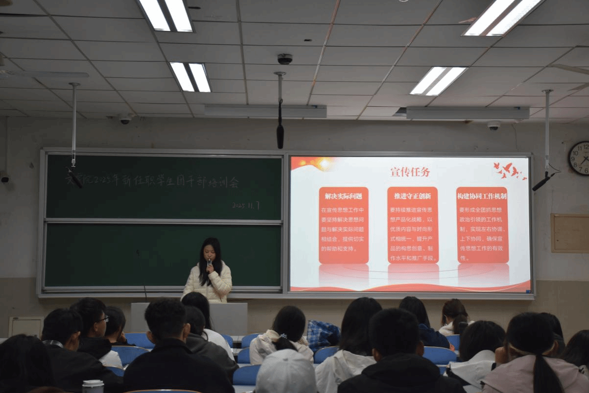 为深入学习贯彻党的二十届四中全会精神,深入领会习近平总书记关于青年工作的重要思想,激励学生团干部挺膺担当,11月7日,文学院举办“实干担当强本领,青春建功启新程”新任职学生团干部培训会。