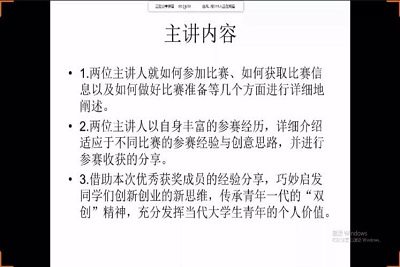 4月11日,商学院科创服务中心利用网络直播形式,开展了一场科创赛事经验分享活动,以扩大科创工作的覆盖面,从而营造良好的科创学术氛围。