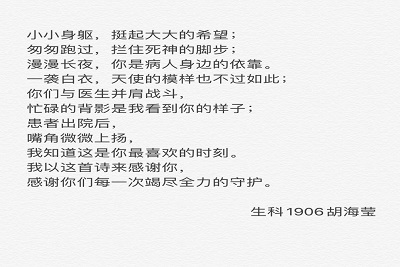 活动正式开始后,商学院同学踊跃报名,积极参与。此次活动,由同学们通过电子作图、小视频、诗歌的形式传达了对“白衣天使”们崇高的敬意。活动进行过程中,不断收到同学们形式各异的创意作品。在这里,同学们用笔描绘出一幅幅感人的画卷以致敬伟大的护士、撰写出一首首优美的诗歌歌颂护士们孜孜不倦,无私奉献的精神。活动最后,商学院青年志愿者协会对参于同学的作品进行评选,并将优秀作品在活动群进行展示。