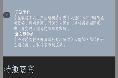 袁文静同学曾凭借《一种经管教学覆藏黑板专利研究》入选2018-2019科研立项校筹,并取得了专利成果。袁文静首先向同学们介绍了她的创意来源,并建议同学们一定要及时抓住脑海中创意的“小尾巴”,即转瞬即逝的灵感。同时,袁晓静希望同学们做好前期,中期,后期每一步的准备,并鼓励大家不用过度担心成败,大胆去做。