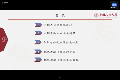 杜鹏教授以其充分的论述对中国人口老龄化与积极老龄化政策问题进行了数据翔实、图表丰富的深入阐释和细致讲解,并从中国人口老龄化现状,中国老龄人口发展趋势,积极老龄化政策实践特点,积极老龄化政策的完善,积极老龄化政策发展目标等方面开展交流。其中,在谈及中国老龄人口发展趋势问题时,杜鹏教授结合自己的最新研究成果同与会师生进行分享,用翔实的数据和清晰的图表揭示出新时代中国人口老龄化三大突出特点,认为从21世纪前半叶中国老年人口规模及比例波动性、阶段化的增长过程来看,2035年和2050年都将是人口老龄化的关键时间节点。杜鹏教授详细阐述了积极老龄化政策划分的四个维度,并就我国近些年来出台的相关政策进行划分与分析。杜鹏教授在谈到积极老龄化政策的完善即积极老龄化政策实践中的问题时特别指出,当前积极老龄化政策的重点依旧集中于养老服务建设等社会保障政策领域,养老的刚性需求与政策的低度供给之间矛盾突出,如何把软性服务与刚性需求相结合,尽可能减少矛盾仍是一个突出问题,且中央与地方老龄政策之间尚缺乏整体性与延续性。杜鹏教授认为,积极老龄化政策在制定时需要更加的精准科学,执行过程中更具操作性,其效果更能够得到绩效评估的验证,以上这些都是积极老龄化政策需要不断丰富完善的问题。最后,杜鹏教授指出,现在的积极老龄化政策无疑是取得了很大的进步,但依然还具备更大的发展空间去做的更好,下一步应当更加注重加强顶层制度设计,构建积极老龄化政策的社会治理体系,用全生命周期理论指导积极老龄化政策与实践,以老年人需求为中心,为其增权赋能,为其社会参与创造良好的社会文化环境并就以上方面进行了相关对策分析。
