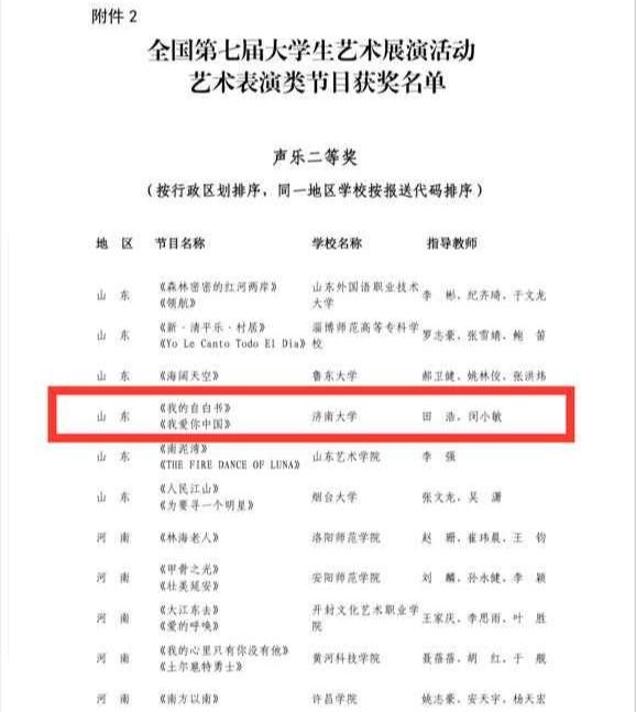 历时半年的全国第七届大学生艺术展演活动近日落幕,教育部办公厅即日公布了获奖结果。在本届艺术展演活动中,由田浩、闵小敏两位老师指导,yl23455永利音乐学院山东泉城合唱团演绎的合唱作品《我的自白书》《我爱你中国》代表学校参赛,斩获声乐类二等奖。
