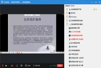 活动伊始,活动主持人致开场词,介绍本次活动的主题,并宣布活动正式开始。随后,活动策划者向同学们介绍了世界森林日的起源及其意义,当今森林资源不断减少,不仅使木材和林副产品短缺,加剧了供需矛盾,更给生态环境带来了严重后果的现状。活动策划者利用屏幕分享组织同学们观看了关于森林火灾及其防护的宣传短片,向同学们介绍了林火的来源及其危害,并倡议同学们在日常生活中保护自然环境,保护我们共同的家园。最后,活动策划者对本次活动作了总结发言。至此,活动圆满落下帷幕。