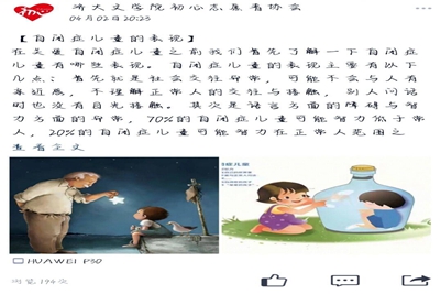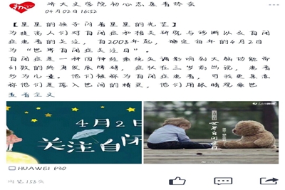 为了向大众普及自闭症,给自闭症患者更多关爱和帮助。自4月2日起,文学院初心志愿者针对世界自闭症日开展了持续两周的“关爱自闭症投稿”的活动。