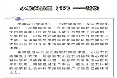 在指导老师弋媛和吕博文同学的带领下,科普实验课堂志愿活动如期进行。志愿者们提前录好实验课堂的视频并写好实验课堂的讲稿,将内容发给少儿图书馆的老师,通过播出实验课堂的形式,为孩子们普及生活小知识及背后的物理小知识。该实验课堂将通过志愿者们的科普视频及老师的讲解,让孩子们感受到磁铁的奥秘。用生活中存在的小现象,让孩子们直观亲切的感受到身边的物理,以此增强他们了解生活中物理小知识的兴趣与积极性。实验课堂在山东省少儿图书馆微信公众号上播出,讲授课程内容丰富易懂,为孩子们普及更多的物理小知识。