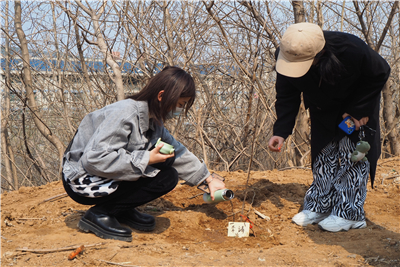 前期学生会开展一系列关于植树节的宣传工作,并组织同学们到马武寨山进行植树活动。本次活动以小组为单位,活动开始后,同学们开始栽种准备好的树苗,这些树苗都是适应北方气候且易活的植物。此次植树活动吸引了许多同学,同学们认真交流,彼此合作完成树苗的栽种,从挖坑到浇水同学们深刻体会到栽种树苗的不易,也体会到了亲自栽种树苗的快乐,同学们给自己种的树命名后并挂在树苗上,活动现场气氛活跃。活动结束后,同学们在横幅上签名,并集体合影留念。