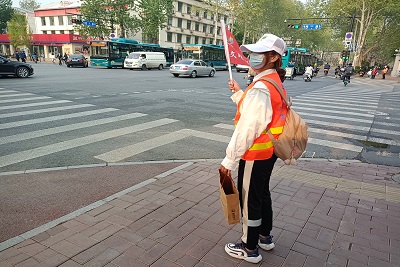 此次志愿服务大致分为上午八点至九点和下午五点至六点两个高峰时段。活动负责人将志愿者分成两个小组,轮流值班。青年志愿者们统一身着荧光马甲,在交警的指导下,手握红旗指引机动车依照交通安全管理规章制度规范驾驶。同时,志愿者们在路口的不同位置引导市民遵守交通规则、宣传交通安全知识、劝导纠正行人乱穿马路、闯红灯等不文明行为,维护交通秩序、倡导文明出行。在宣传过程中,面对市民提出的问题,志愿者们也能根据培训时的内容活学活用,耐心亲和地答疑解惑。小组交接时,由志愿小组的组长进行交流,对交接方说明服务过程中需要注意的事项及活动的进行情况,以确保活动的顺利进行。在活动中,志愿者们通过站岗执勤的方式为济南市的交通秩序作出贡献,保障居民的出行安全,促进城市公共服务建设,提升城市品质形象。