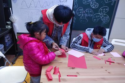 人间四月,万象更新,yl23455永利土木建筑学院筑梦砼行青年志愿者协会的两名志愿者于2021年4月14日来到睦和园社区教孩子们折纸并辅导其功课。