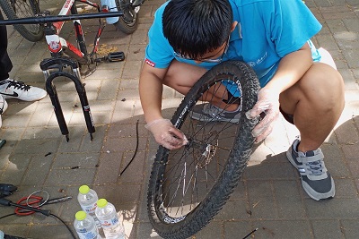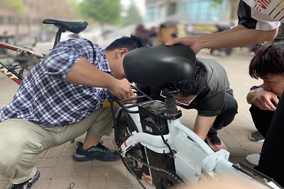当天下午天色阴沉,但队员们仍旧提前到达活动地点,摆放好工具,整齐地站在横幅前等待着求助者的到来。面对遇到困难的车主,队员们展现出认真务实的态度,热心地询问车辆的情况,一丝不苟地对车辆进行检查,找出车辆的问题所在。在修车过程中,有一位山地车刹车失灵的车主前来求助,队员们仔细检查发现是闸线过松导致刹车失灵,队员们仔细调节闸线,每调节一次都会重新检查,就这样调节了多次之后解决了这辆车的问题。紧接着又有一位车主前来求助更换车胎,这时天空已经开始下起小雨,但队员们仍旧冒着雨将新轮胎装,修车过程中,队长合理分工,队员们团结合作,互相配合,共同交流,虽然这次小雨给队员们带来不小的干扰,但队员们仍旧完成这次修车任务。随着横幅落下,此次义务修车活动圆满落幕。