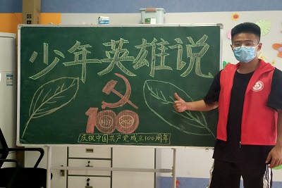 阳光炽热,正如志愿者们的满腔热情。志愿者们到达“四点半”课堂后,先整理好桌椅,调整好设备,在黑板上板书“少年英雄说”并进行装饰,等待小朋友们的到来。活动开始,小朋友们被分成三组,由志愿者带领着进行本次活动。许莹莹作为本次活动的讲师,以生动有趣的方式讲述了邓恩铭同志在革命战争年代英勇无畏地斗争事迹,展现了一名优秀共产党员的风采。期间,小朋友们扮演了邓恩铭同志,与志愿者们进行互动,更加身临其境地感受了他排除困难,毅然决然地参加革命运动的大无畏精神。活动最后,在志愿者的领读下,小朋友们整齐而嘹亮地朗读了《少年中国说》。在稚嫩有力的声音中,小朋友们传达出了自己对祖国的爱。朗读后,志愿者们为小朋友颁发红领巾进行鼓励,本次活动取得圆满结束。