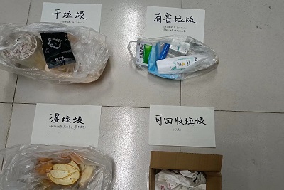 志愿者们首先通过网络查询、线上咨询等方式了解到了基本的垃圾分类知识后,认真地将宿舍里的垃圾按照干垃圾、有害垃圾、湿垃圾和可回收垃圾进行分类整理,并在各类垃圾前贴好相应的标识。在此过程中志愿者们不仅将自己宿舍内的垃圾进行了分类,而且积极带动周围宿舍同学参与其中。在垃圾分类的实践中,志愿者们进一步深化对垃圾分类的认识,也学习到更多垃圾分类的技巧与知识。为更好地践行绿色环保、垃圾分类的理念,志愿者提出将收集到的可回收垃圾送给宿管人员和每天清扫校园的环卫工人们,将其回收以实现资源利用的最大化。