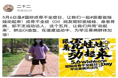 2022年5月6日,是第13个“国际成骨不全症日”。为给罕见骨病群体加油、增加同学们对这一群体的了解、提高这一群体的生活幸福感和社会参与度,5月6日至5月8日,商学院青年志愿者协会线上举办“一起运动,我们的爱不脆弱”活动,呼吁同学们与瓷娃娃一起运动,鼓励同学们为瓷娃娃公益贡献自己的一份力量。