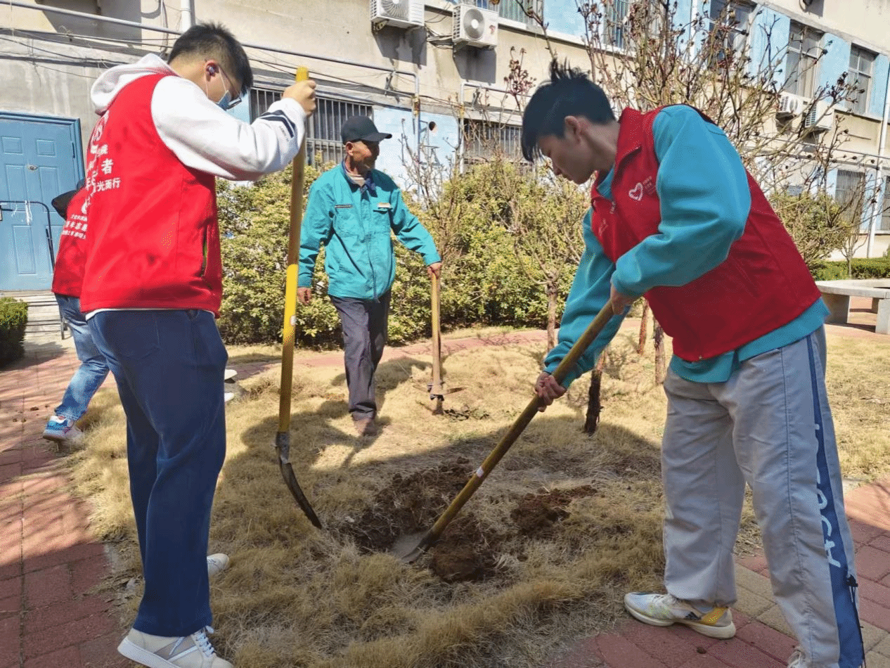 为了给树苗创造适宜的生长环境,活动当天,志愿者们分工合作,有序清扫枯枝落叶,处理场地垃圾。活动组织者骆敬茹同学在现场向志愿者们介绍植树节的来历。她谈到,植树节的起源与孙中山先生有着密切联系,他最早意识到森林重要性并号召植树造林。为帮助同学们充分了解植树的步骤和原理,学院还邀请了园林部门工作人员对同学们进行指导。志愿者们认真学习植树技巧,从挖坑、培土到浇水,每一个环节都井然有序。经过一上午的努力,新栽种的棵棵小树苗迎风而立,为文旅楼增添新的生机与活力。活动最后,同学们将写有对未来美好期望的丝带悬挂在枝头,寓意为“‘植’得期待”,愿他们的期望都能迎风飘扬。