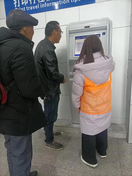 为保障春节期间旅客的安全出行,材料2309班王芳芳在平阳站积极参与春运志愿服务,负责引导和照顾进站候车的旅客,协助搬运物品,为不熟悉进出站路径的旅客指引道路,缓解了春运高峰压力,提高了旅客的出行效率。同时,王芳芳在入站口等人流密集场所进行文明劝导,帮助维护良好的安检秩序,为旅客安全便利出行积极贡献力量。