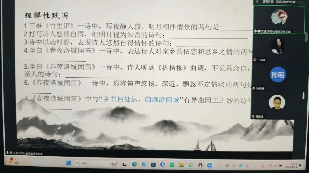 活动开始前,志愿者调查了孩子们对《竹里馆》和《春夜洛城闻笛》的了解状况,认真搜集资料并精心设计本次线上课堂内容,制作了精美的PPT辅助授课。在活动过程中,志愿者通过精心制作的课件和视频,讲解诗歌的创作背景,向参加活动的青少年展示诗词吟诵之美。在诗意的赏析中,孩子们领略到诗中的思乡之情和悠扬笛声所营造的春夜氛围,感受到了中华文化的博大精深。
