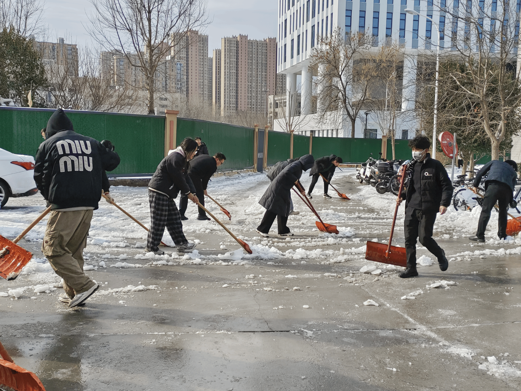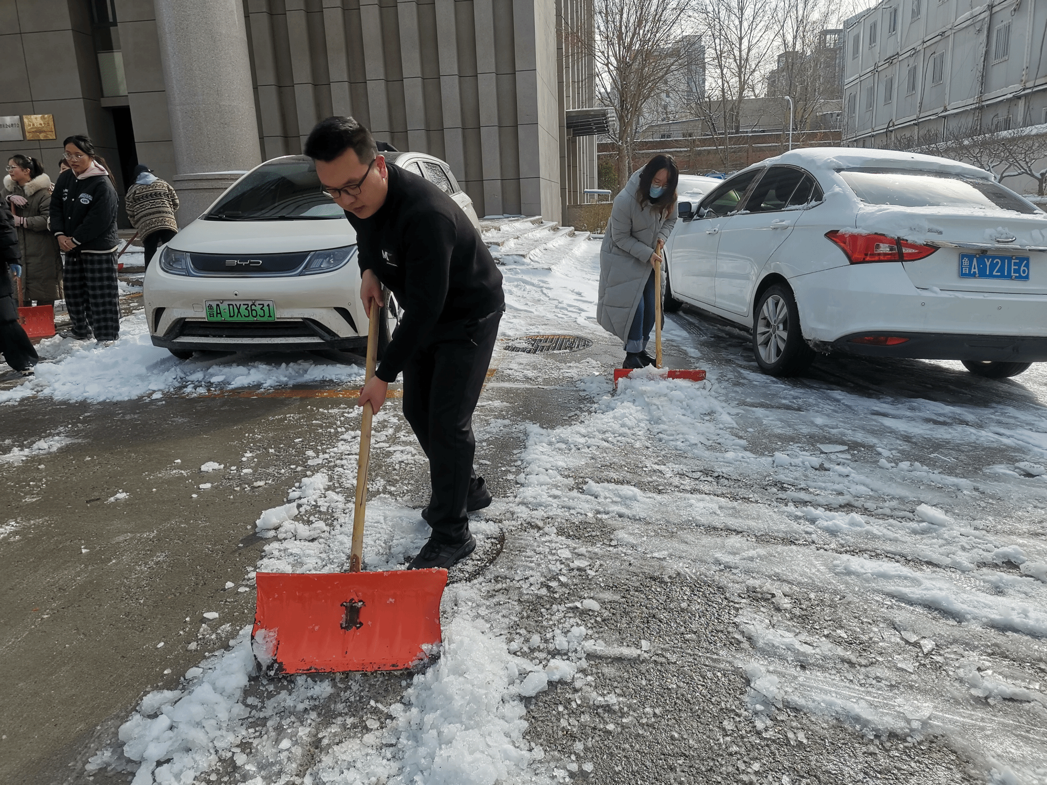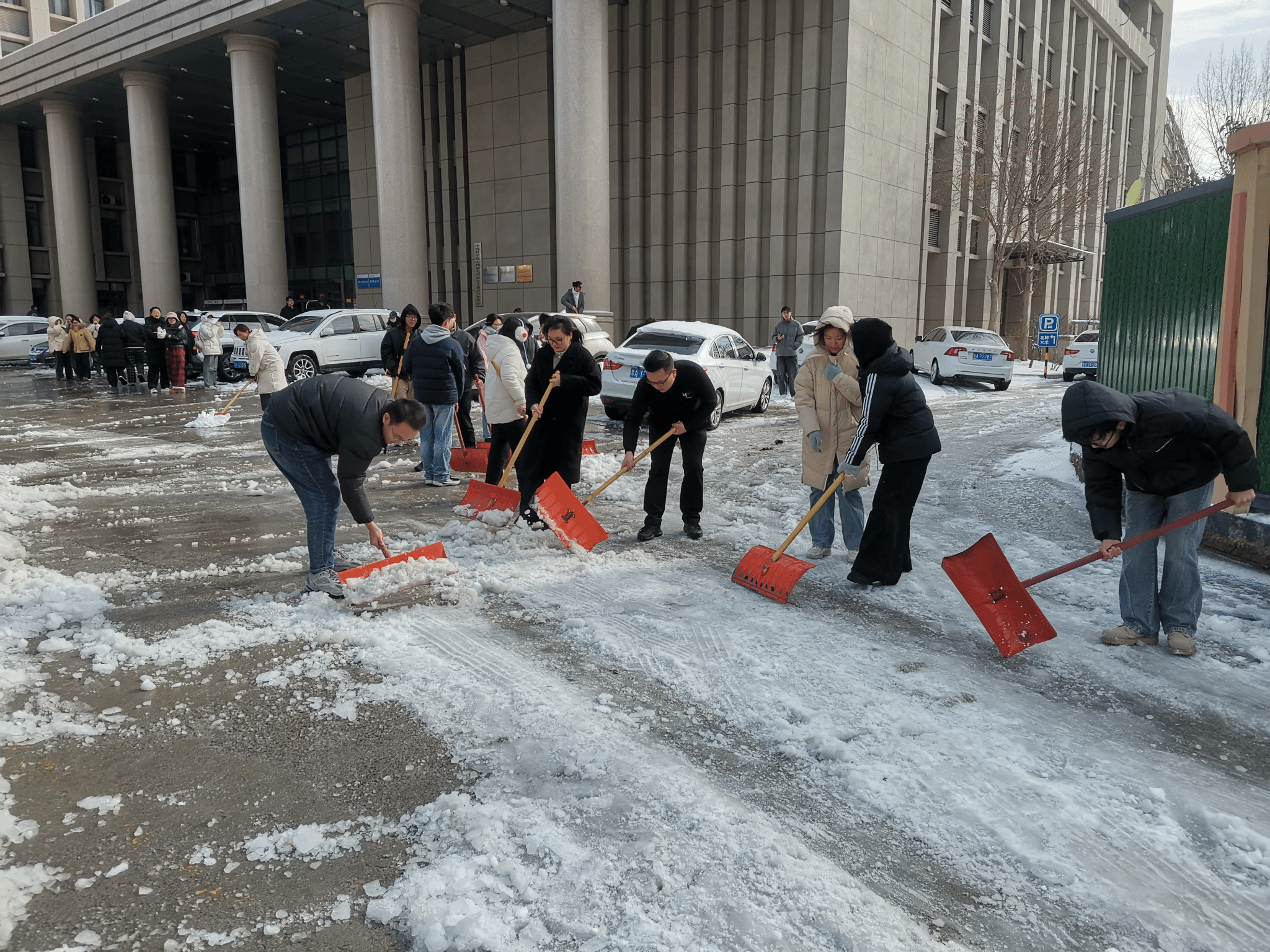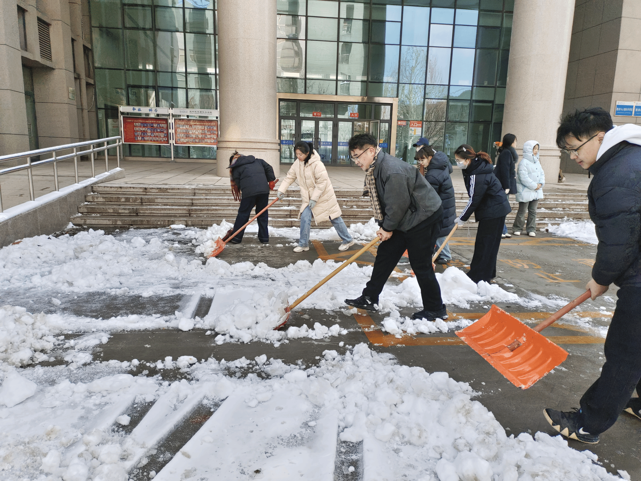尽管寒风凛冽,积雪深厚,但青年志愿者们的热情丝毫未减。在老师们的有序带领下,志愿者们迅速领取铁锹、扫帚等清雪工具,投入到紧张的清雪工作中。大家分工明确,有的负责铲除主干道上的厚积雪,有的清理人行道上的薄雪和结冰区域,还有的清扫阶梯边缘及公共设施周边的积雪。志愿者们充分发挥先锋模范作用,不畏寒冷,干劲十足,全力清除特教楼前的积雪,师生们的出行安全得到了有效保障。