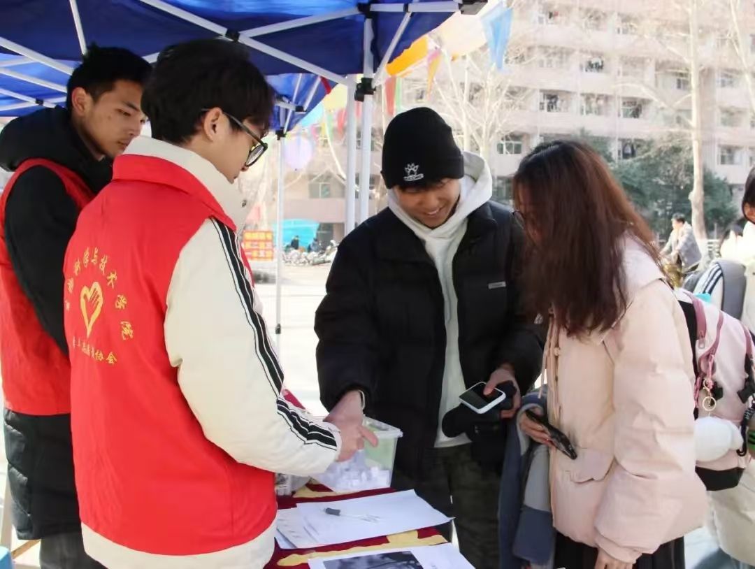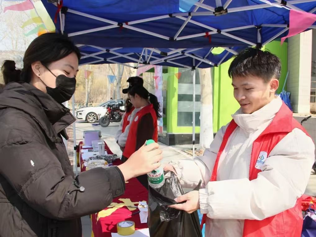 在校内的八食堂广场也在进行着公益活动。在废物兑换的“废品回收区”,同学们不仅让废品再次利用,还进行了关于废品处理、微生物分解、生态保护等方面的答题。在此过程中,同学们既掌握到相关知识,又能进一步理解生态保护理念。