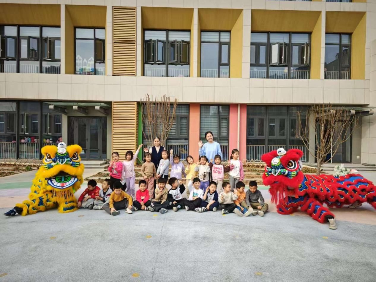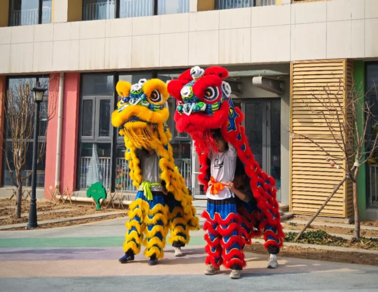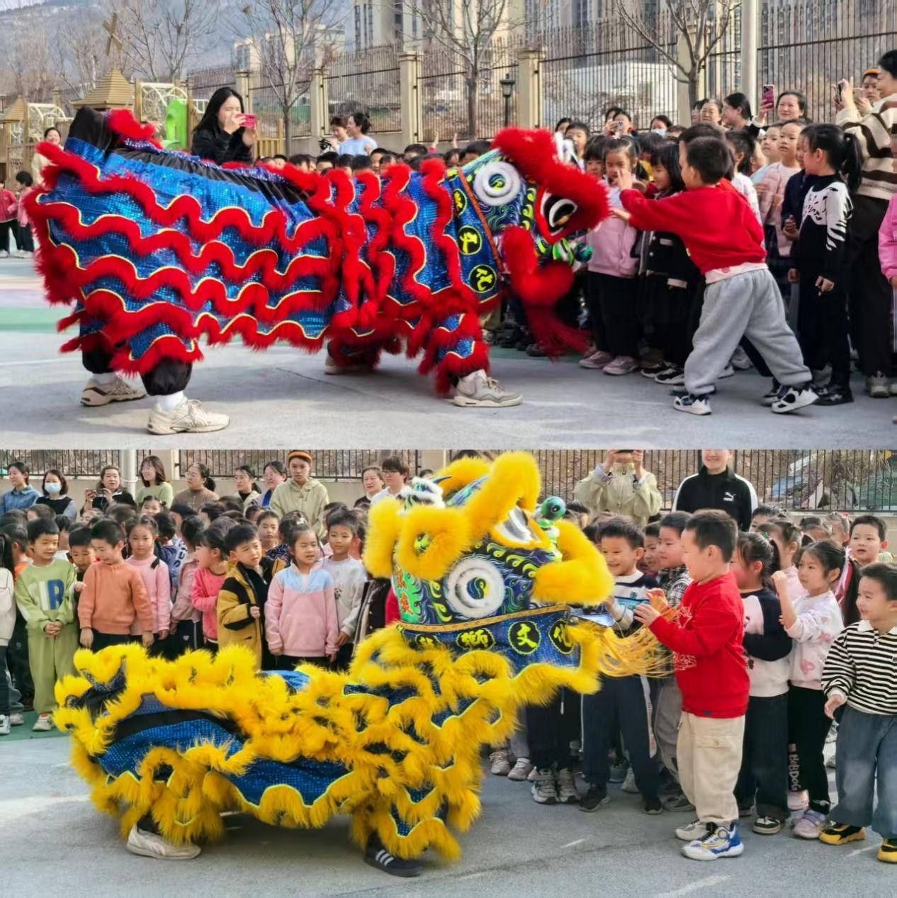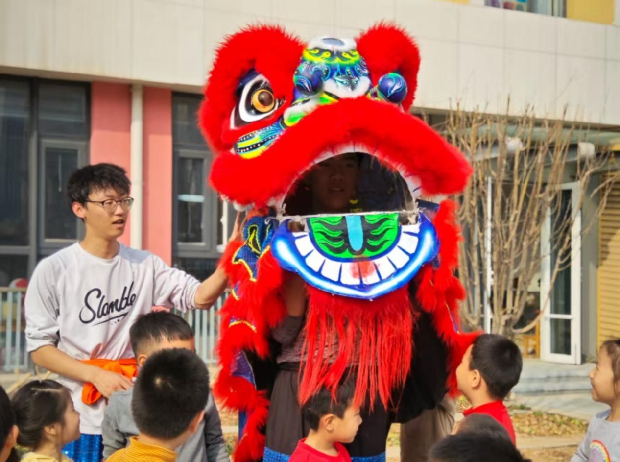 活动当日,幼儿园里处处洋溢着孩子们的欢声笑语,体育学院的师生们一入园,便被孩子们纯真的热情所包围。随着激昂的锣鼓声响起,威风凛凛的舞狮闪亮登场。那矫健的步伐、活泼的神态,将狮子的精气神展现得淋漓尽致,仿佛赋予了这古老的艺术形式新的生命力,孩子们的眼睛里闪烁着好奇与兴奋的光芒。在精彩的舞狮表演后,体育学院的同学们还亲自指导孩子们学习舞狮的基本动作,从简单的摆头、跳跃,到步伐的移动,每一个动作都耐心细致地讲解示范,在同学们的帮助下,有模有样地模仿起来,稚嫩的脸上写满了认真。这一刻,龙狮舞狮文化不再是书本上遥远的传说,而是化作孩子们亲身体验的快乐与传承的责任。