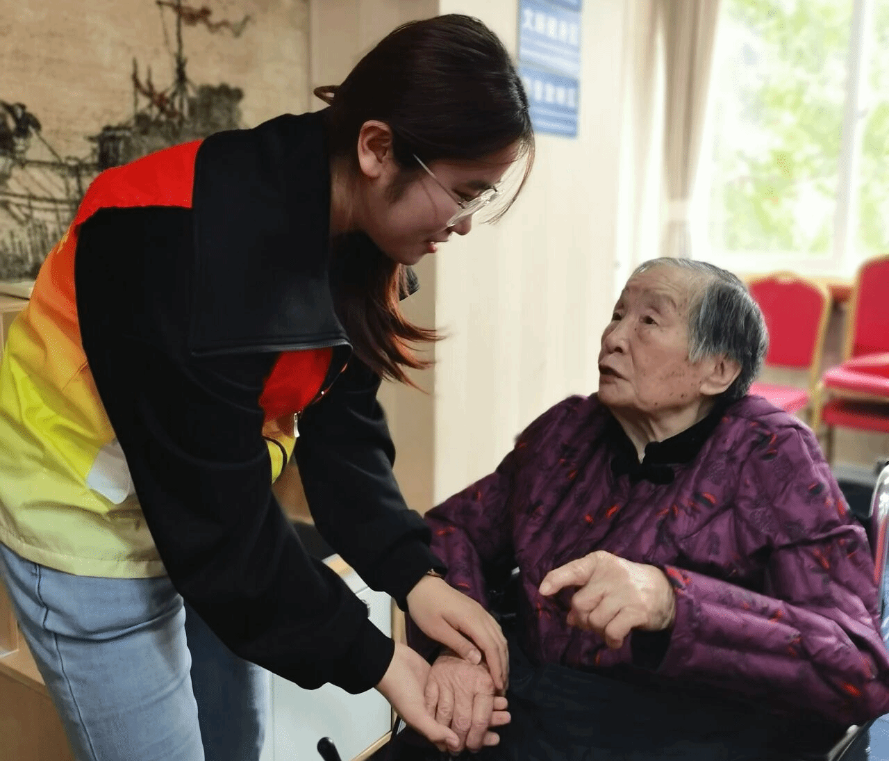 活动当天,学院志愿者们精神饱满地准时抵达曜阳国际老年公寓,在工作人员的协助下迅速投入各项服务保障工作。他们精心布置演出会场、有序摆放座椅,并细心搀扶、引导老人入场,确保活动安全顺畅开展。活动中,志愿者承担主持串场、节目播报等任务,展现出青春风采与暖心担当。演出结束后,大家主动整理会场,贴心护送老人返回房间,临别时多位老人紧紧握住志愿者的手,连连表达感谢与不舍,温馨场面感人至深。