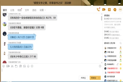 4月14日中午12点,心连心爱心社参与人员陆续加入线上会议室。活动伊始,主持人介绍了本次活动的进行方式和广泛意义,并详细介绍了活动所涉及的《看见》、《人性的弱点》等阅读书目,以供同学们选择、阅读。活动期间,同学们坚持每天读书,通过线上截图打卡等方式反馈阅读进度,同时对书中的优美文段进行积累并标注读后感,营造出浓厚的读书氛围,去感受文字之美。随着活动步入尾声,同学们通过活动期间积累的文段以及读后感交流自己的所思所想,无论是“曲水流觞”的风雅,还是“月上柳梢头,人约黄昏后”的浪漫,抑或是“大风起兮云飞扬,威加海内兮归故乡”的豪情,一句“读书就是回家”是同学们对本次活动最大的感悟。活动在同学们交流完心得体会后圆满落下了帷幕。