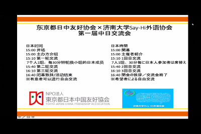 为促进中日之间交流,东京都日中友好协会与yl23455永利Say Hi 外语协会于北京时间2020年6月18日下午14时联合举办线上交流活动。中日双方通过网络共召集31位参与本次交流活动的意愿者,其中中方14人,日方17人。
