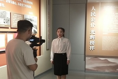焦裕禄纪念馆位于山东省淄博市博山区北崮山村,这里也是焦裕禄同志的家乡。焦裕禄纪念馆由3个展室,通过文字、照片、书法、绘画、音像、群雕、实物等真实、形象、生动地再现了焦裕禄同志全心全意为人民服务的一生,向参观者展示的是焦裕禄同志和广大人民群众一追洪水、查封口、探流沙,深入实际、调查研究,翻淤压沙、植树造林、兴修水利,改变兰考贫穷落后面貌的生动场景。往前不远的映背墙上江泽民主席的题词“向焦裕禄同志学习,全心全意为人民服务”几个大字在绿树和鲜花的映衬下,更加光彩夺目。团队成员分别在焦裕禄雕像、焦裕禄事迹展厅、影像厅等地方讲解并录制视频,大家共同完成此次活动。
