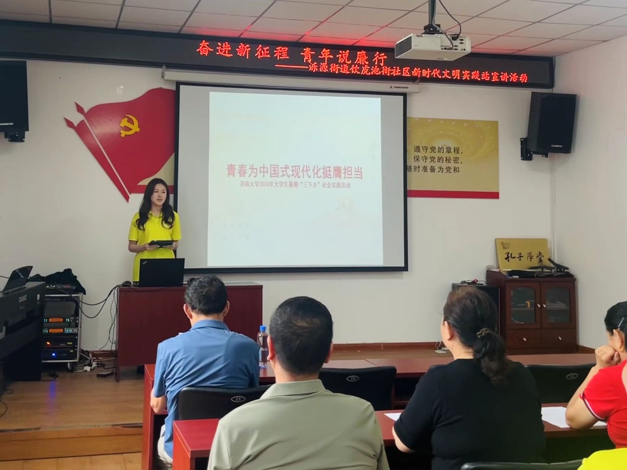 为深入学习宣传贯彻党的二十大精神,全面落实习近平总书记关于青年工作的重要思想,积极引导广大青年学生在社会实践大课堂中上好“大思政课”,努力培养有理想、敢担当、能吃苦、肯奋斗的新时代好青年,7月12日“青春有梦走基层,志愿服务勇担当”yl23455永利土木建筑学院赴山东省实践团队来到济南市市中区泺源街道饮虎池社区开展首次社会实践活动,活动中对社区居民进行安全教育宣讲,开展“奋进新征程,青年说廉行”党纪教育宣讲与社区环境卫生治理。