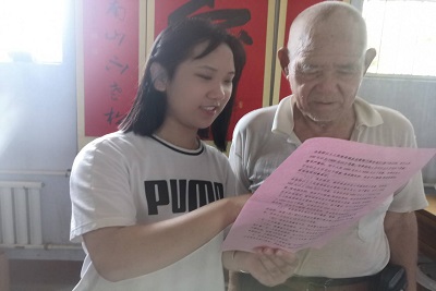 在与村委会成员讨论商议之后,我们决定集中刊印宣传单页并免费发放给村民。但在实施的过程中,由于村里居民大部分都是60岁以上的老人,文化程度较低,信息来源单一,所以宣传效果并不理想。经过反思之后,我充分拓展了自己的思路,准备趁老年人在树荫下乘凉时对宣传单页上的内容进行集中讲解,或是亲自入户普及法律知识。